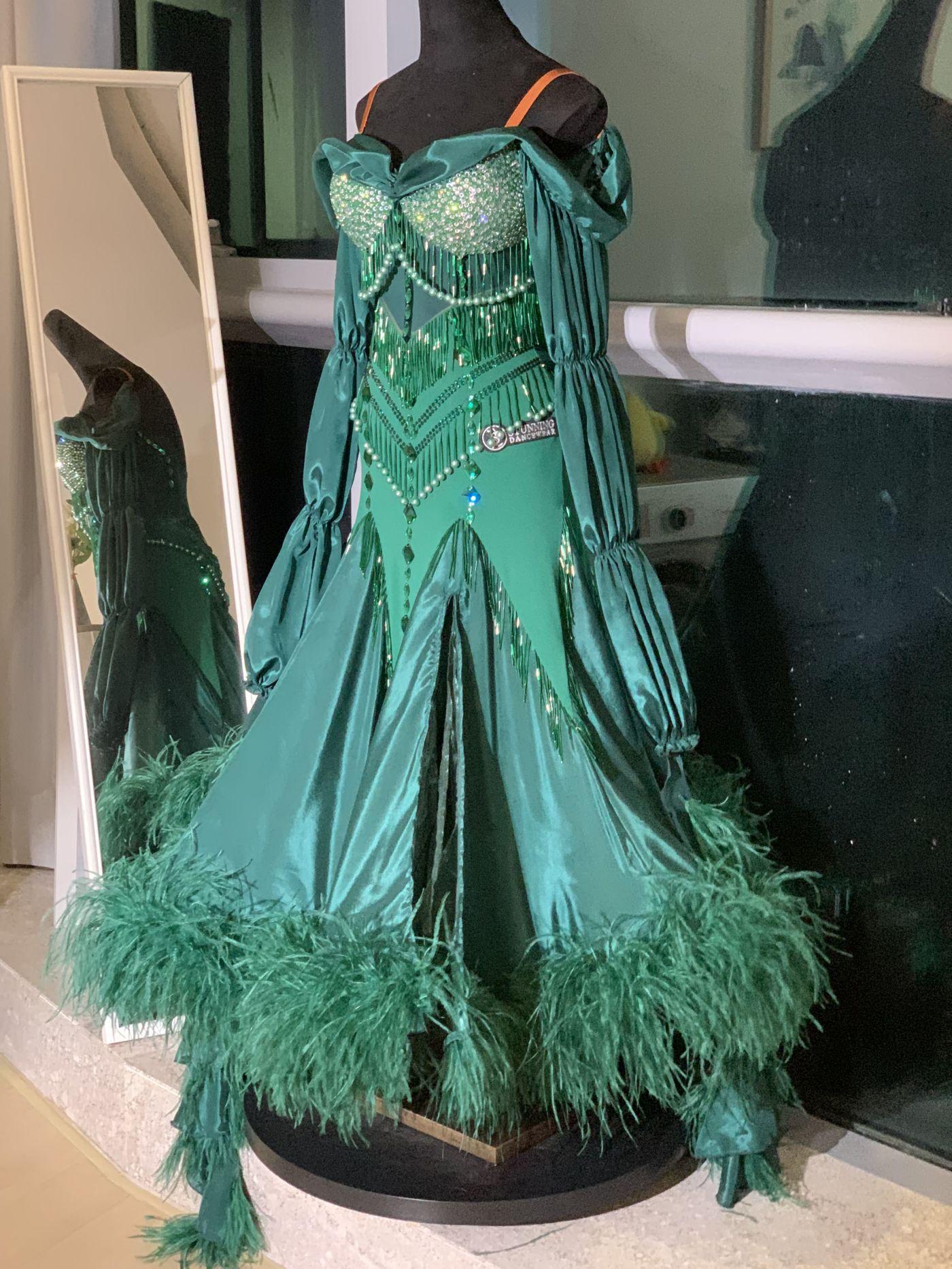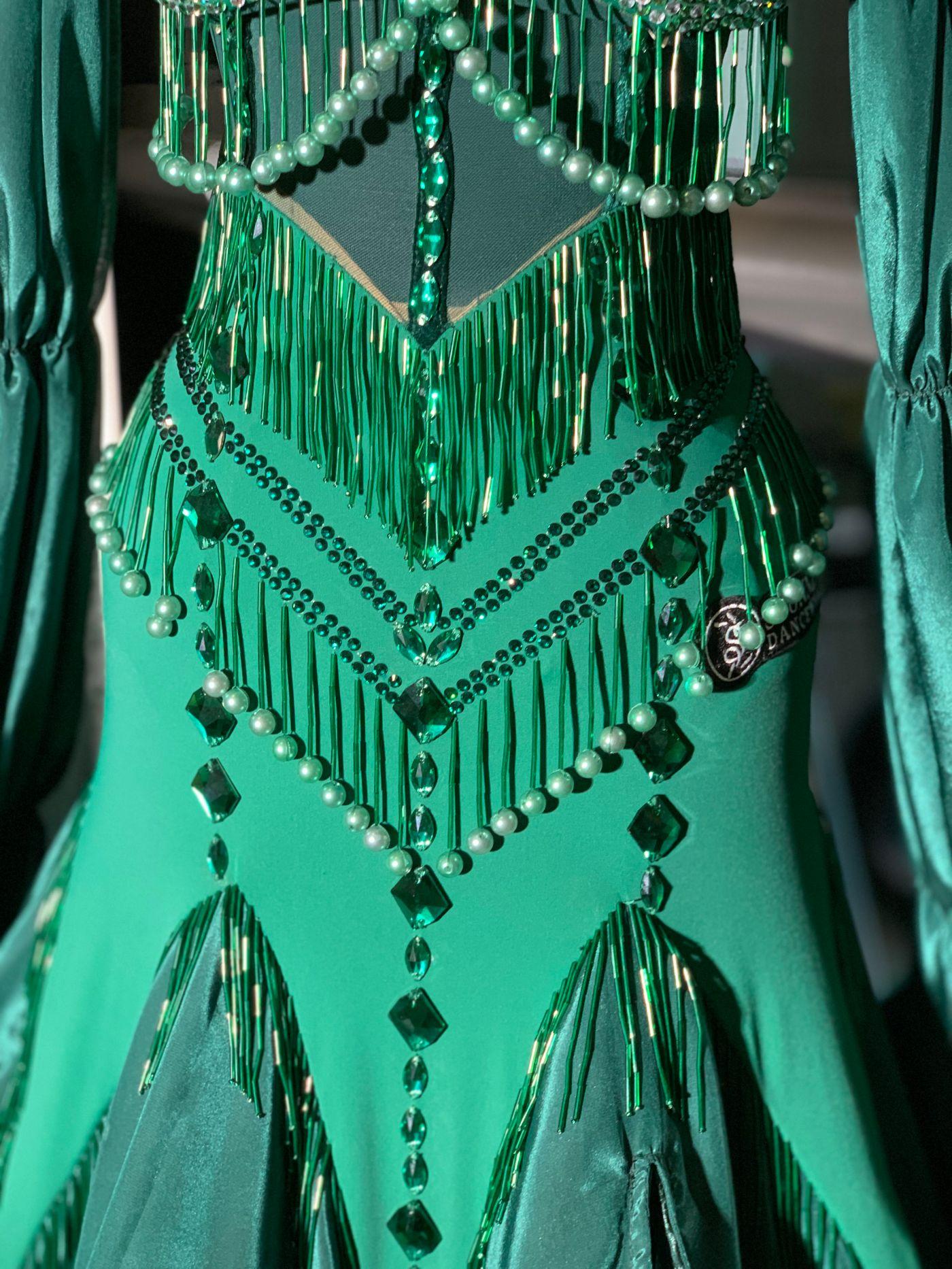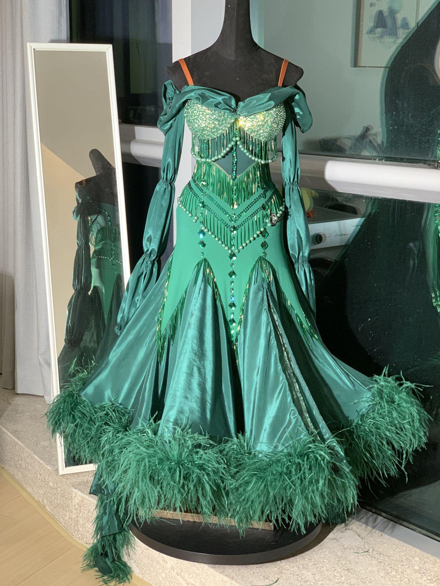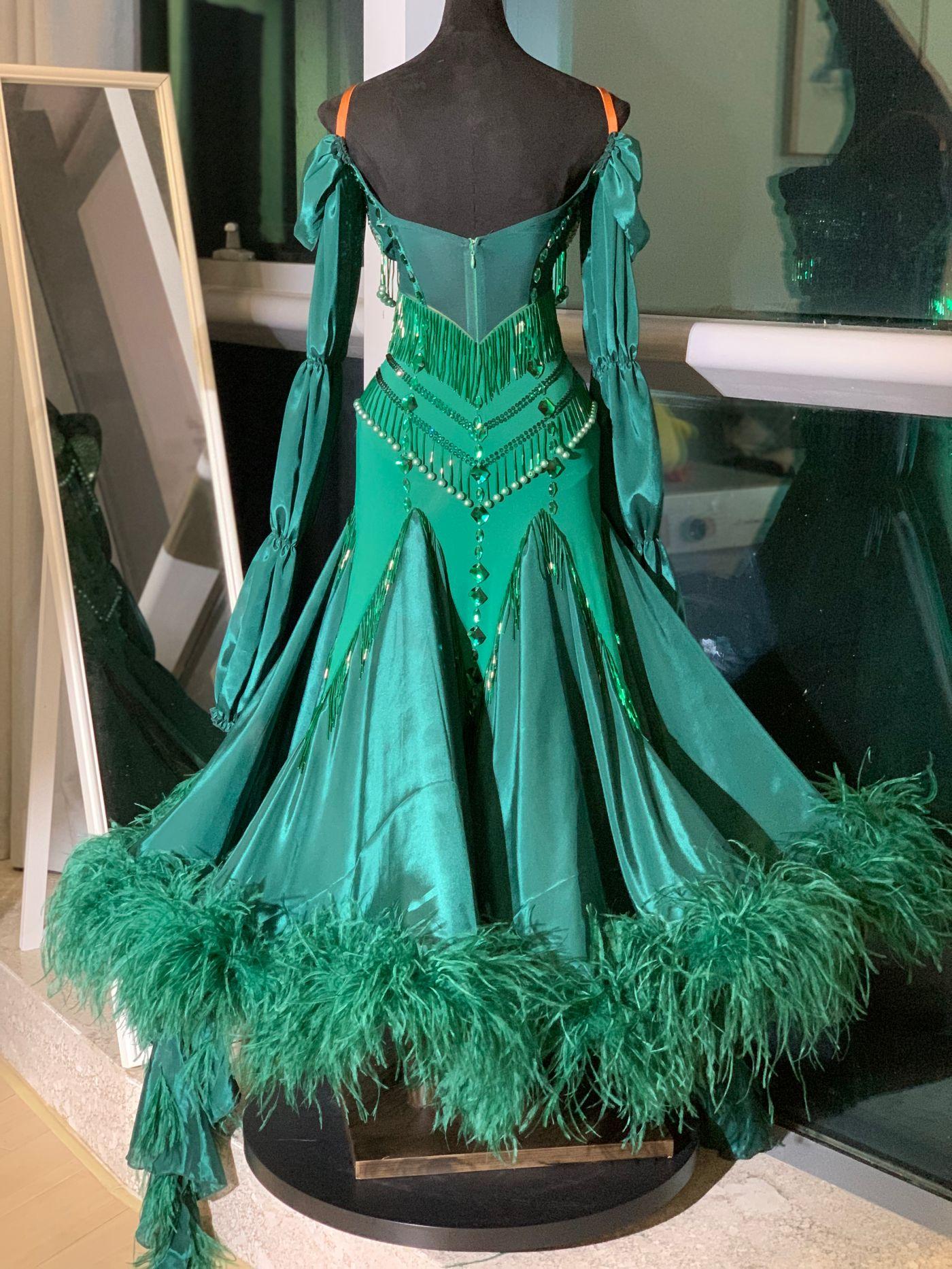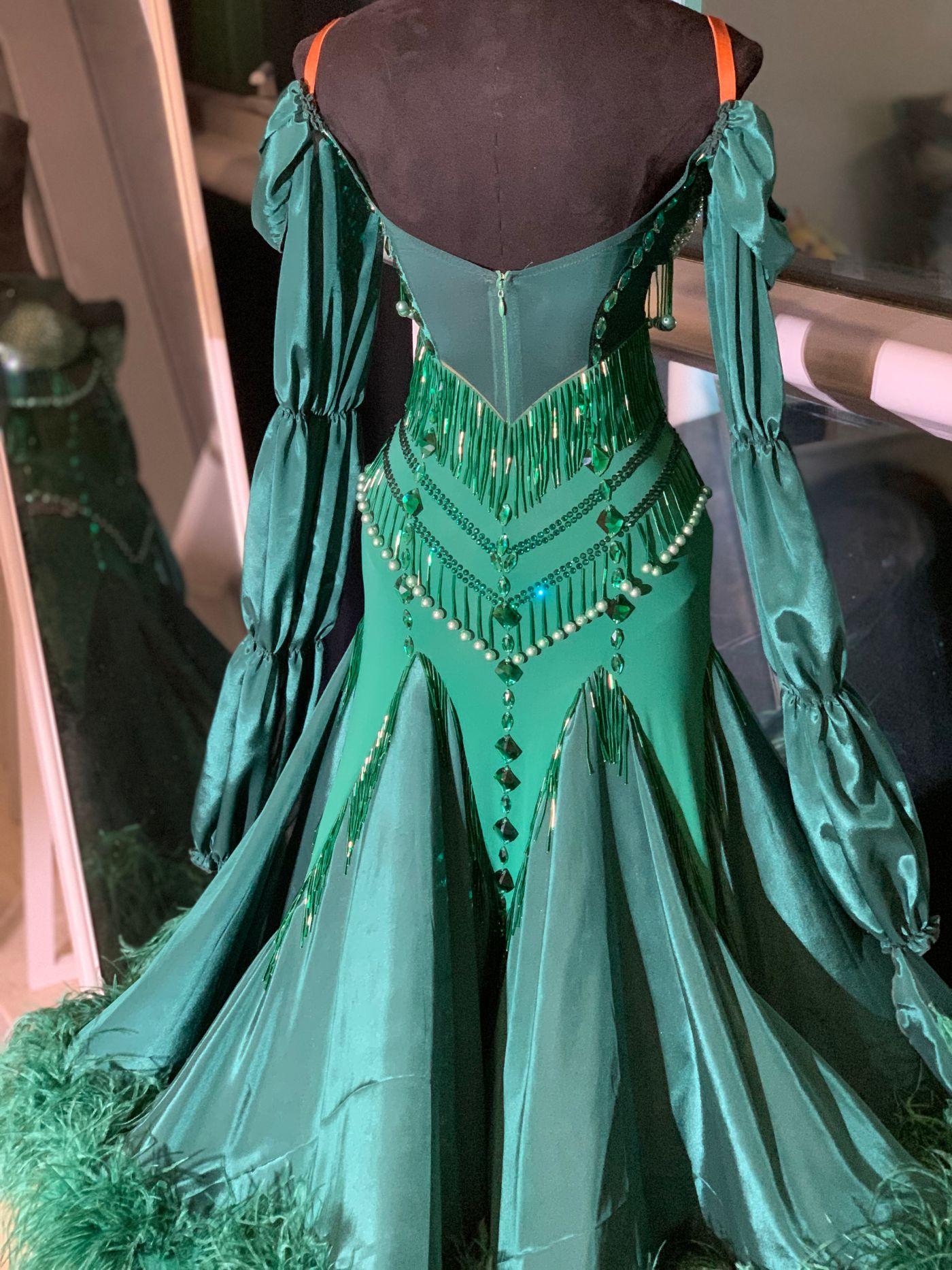 This dress has an oriental faver like Queen Jasmine. Large three-tiered puff sleeves create volume in the float. Bright mint green stones are laid over a dark green fabric to tone up the whole look. The skirt is made large and light, with a hidden slit.