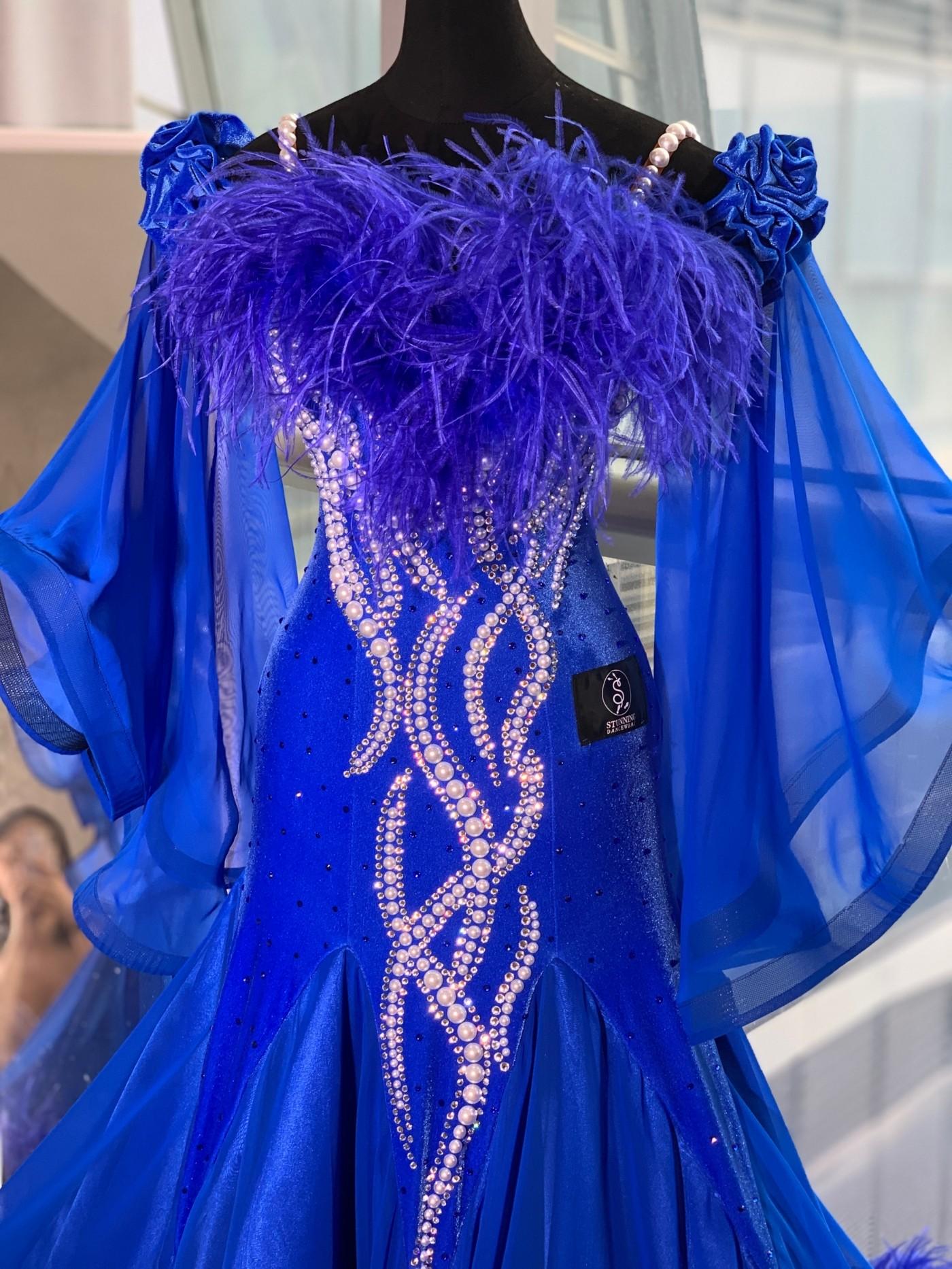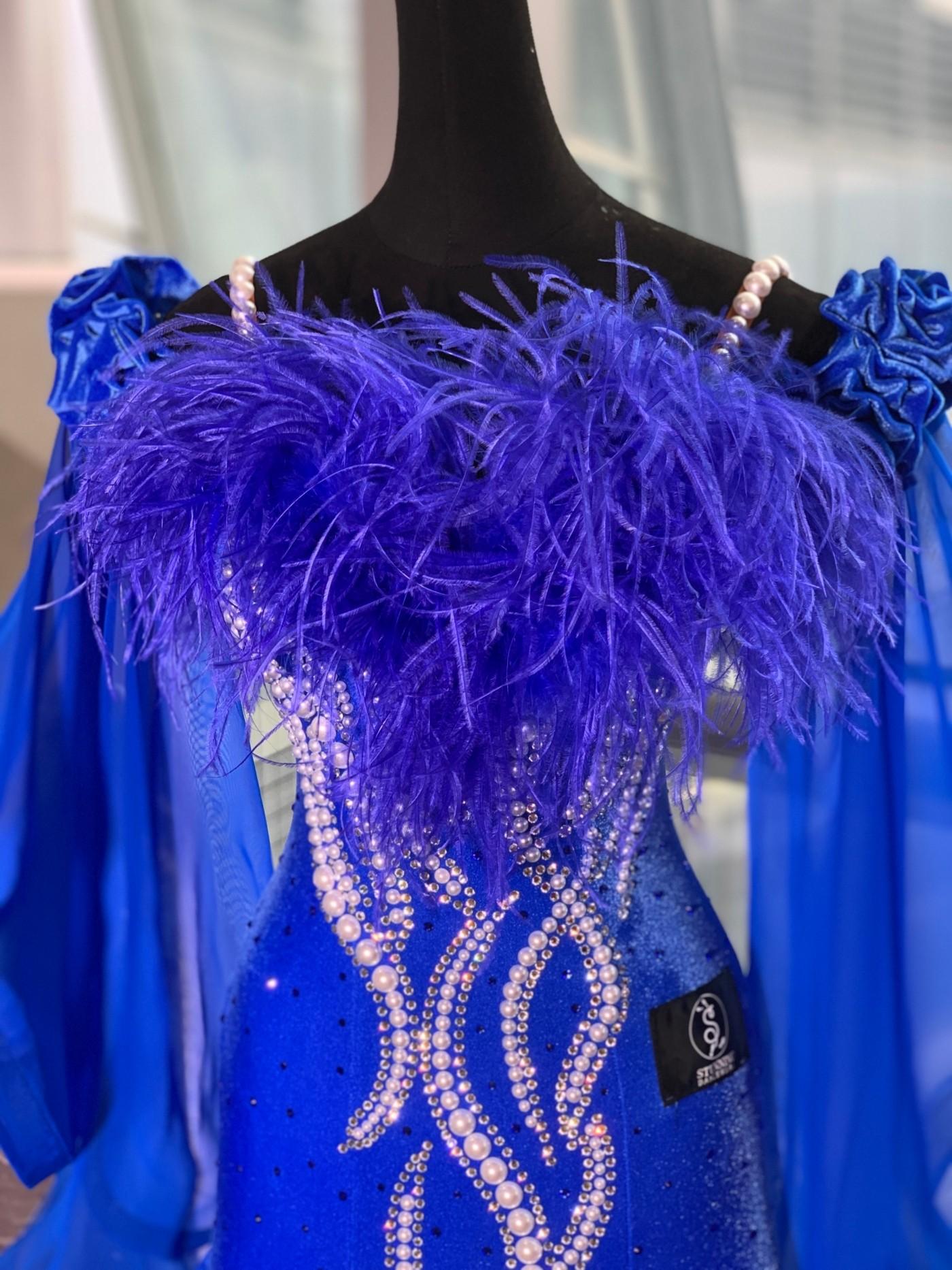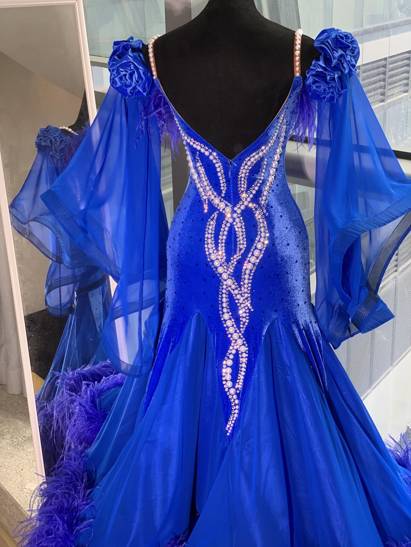 Smooth, shiny velvet is best paired with dark colors. Ostrich feathers, velvet, and pearls are used to create a luxurious look. Because the colors are dark, the skirt is made in a way that it does not look heavy in order to create an overall lightness.