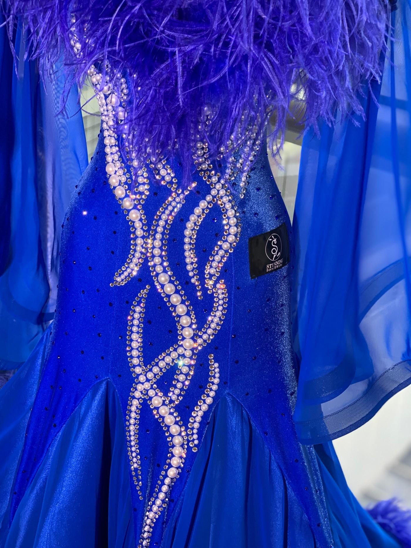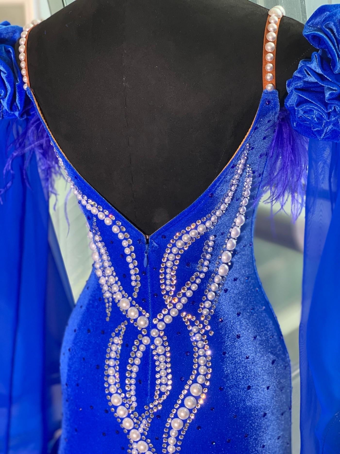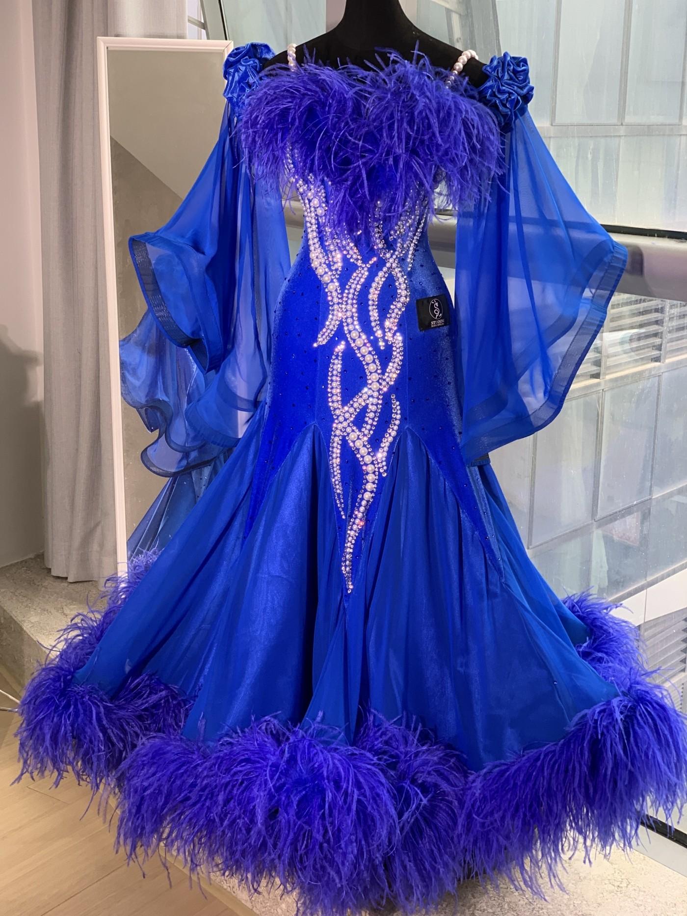 Smooth, shiny velvet is best paired with dark colors. Ostrich feathers, velvet, and pearls are used to create a luxurious look. Because the colors are dark, the skirt is made in a way that it does not look heavy in order to create an overall lightness.